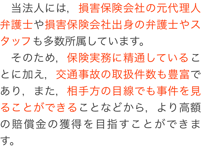① 圧倒的な交通事故解決実績 (交通事故解決実績累計30,000件以上※) ② 損害保険会社の元代理人弁護士 ③ 損害保険料率算出機構(自賠責調査事務所)の元職員 ④ 顧問の整形外科専門医との連携 ⑤ 交通事故チームが集中的に対応 ⑥ 気持ちの部分まで満足 ⑦ 年間30回以上の交通事故研究会の開催